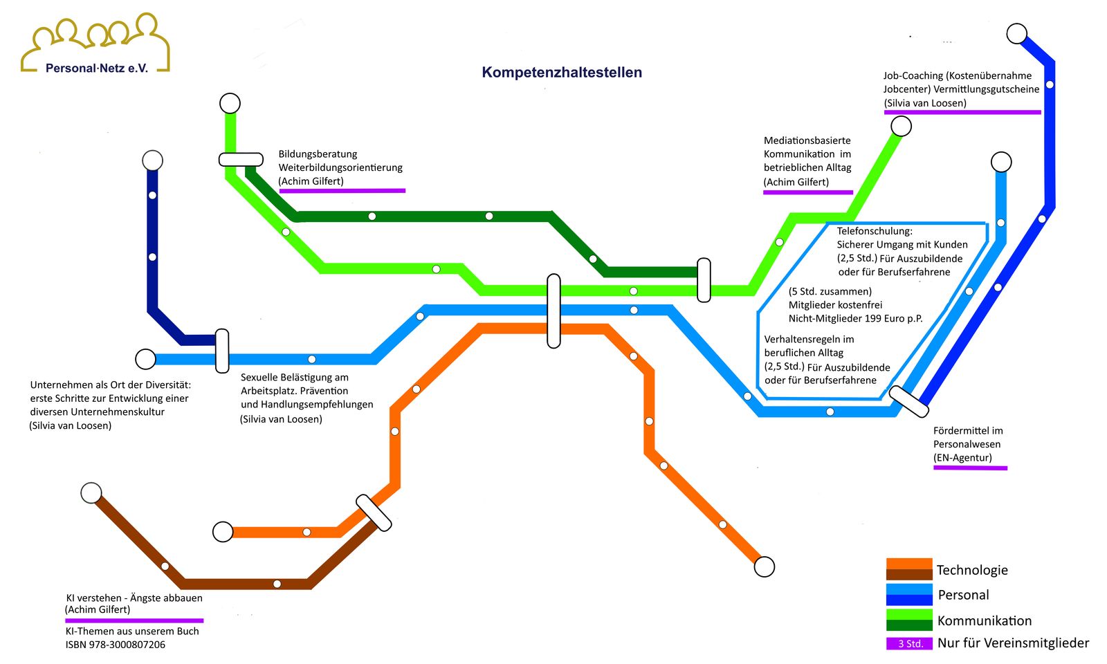 Auf diesem Bild finden Sie unsere ersten Kompetenzhaltestellen. Sie finden hier die Themen zu unseren Workshops, Seminaren oder Vorträgen. Lila gekennzeichnet sich Leistungen, die ausschließlich für Vereinsmitglieder nach Terminabsprache kostenfrei verfügbar sind. Klicken Sie auf die Grafik für eine volle Ansicht.